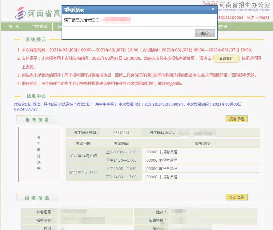 完善信息之后会弹出来准考证号,记得保存一下。需现场确认的考生,必须戴好口罩,做好防疫措施。以上几个环节缺一不可。考生只有完成缴费才算注册成功。只注册不报考的考生、报考但未现场确认身份信息的考生,注册报考无效。