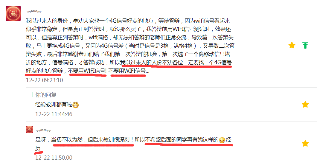 考生须在实践环节和毕业论文(设计)报名系统中认真填报各项信息,确保报考信息准确无误,不要进错会议室。否则,不能参加答辩或答辩成绩无效,后果由考生本人自负。答辩具体时间和腾讯会议号、密码,请密切关注微信公众号中发布的通知。