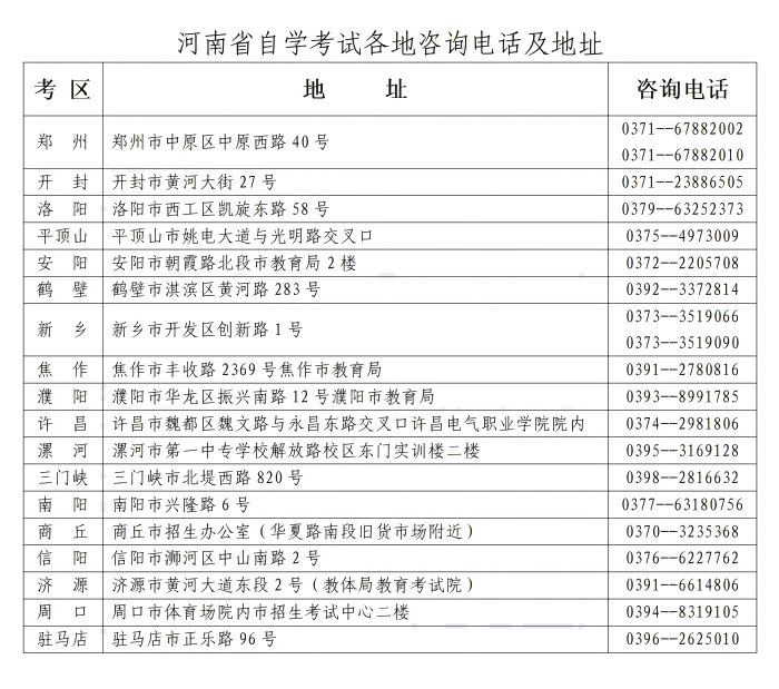 (二)考生在报名过程中遇到问题可拨打报名所属考区教育招生考试机构咨询电话(联系方式见下文)反映解决问题。同时,密切关注官方网站“河南省教育考试院”(http://www.haeea.cn)、“河南招生考试信息网”(http://www.heao.com.cn)、“河南省高等教育自学考试考生服务平台(zkwb.haeea.cn)”和官方微信公众号“河南省教育考试院”“招考豫言”及各考区教育招生考试机构发布的相关信息。
