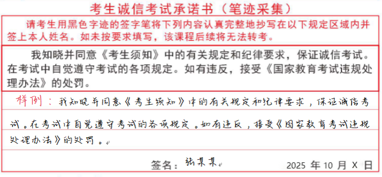 1.落实笔迹信息采集要求。考生应在答题卡指定区域完整抄写《考生诚信考试承诺书》并签名(抄写样例如下图),省教育考试院将采集此处的抄写内容作为考生笔迹信息,并随课程成绩记入考生考籍档案。