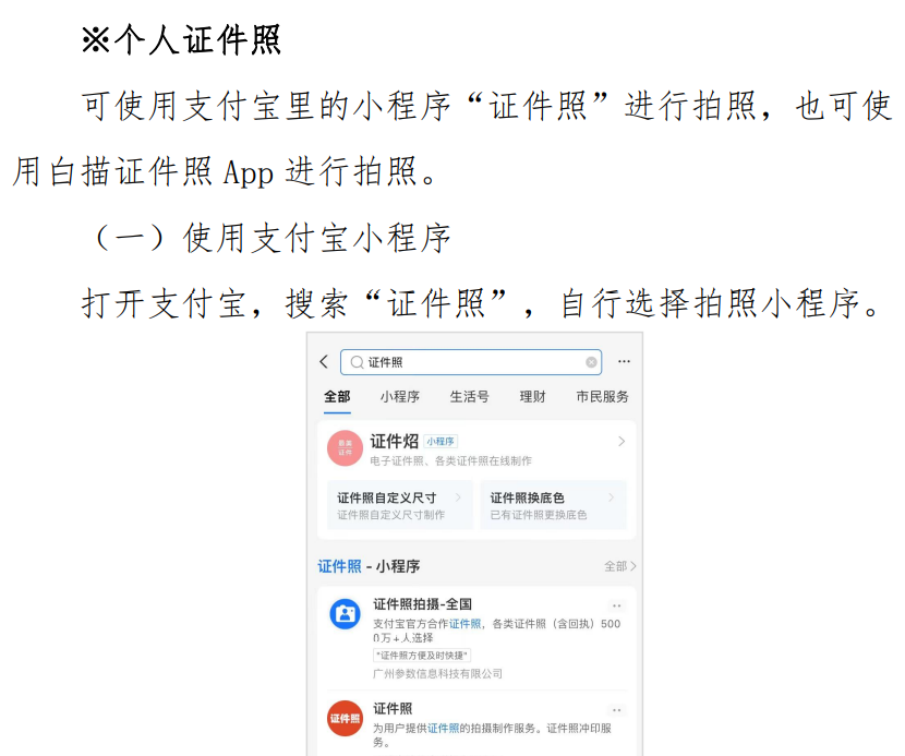 (一)、网上报名考生应于2022年12月4日18:00前登录报名系统,注册完善个人信息、填写提交报名信息、上传本人身份证正、反面照片及近期电子白色背景证件照片(电子照片标准见下面红色字体),并按时完成网上流程。考生要妥善保存注册的用户名和密码。