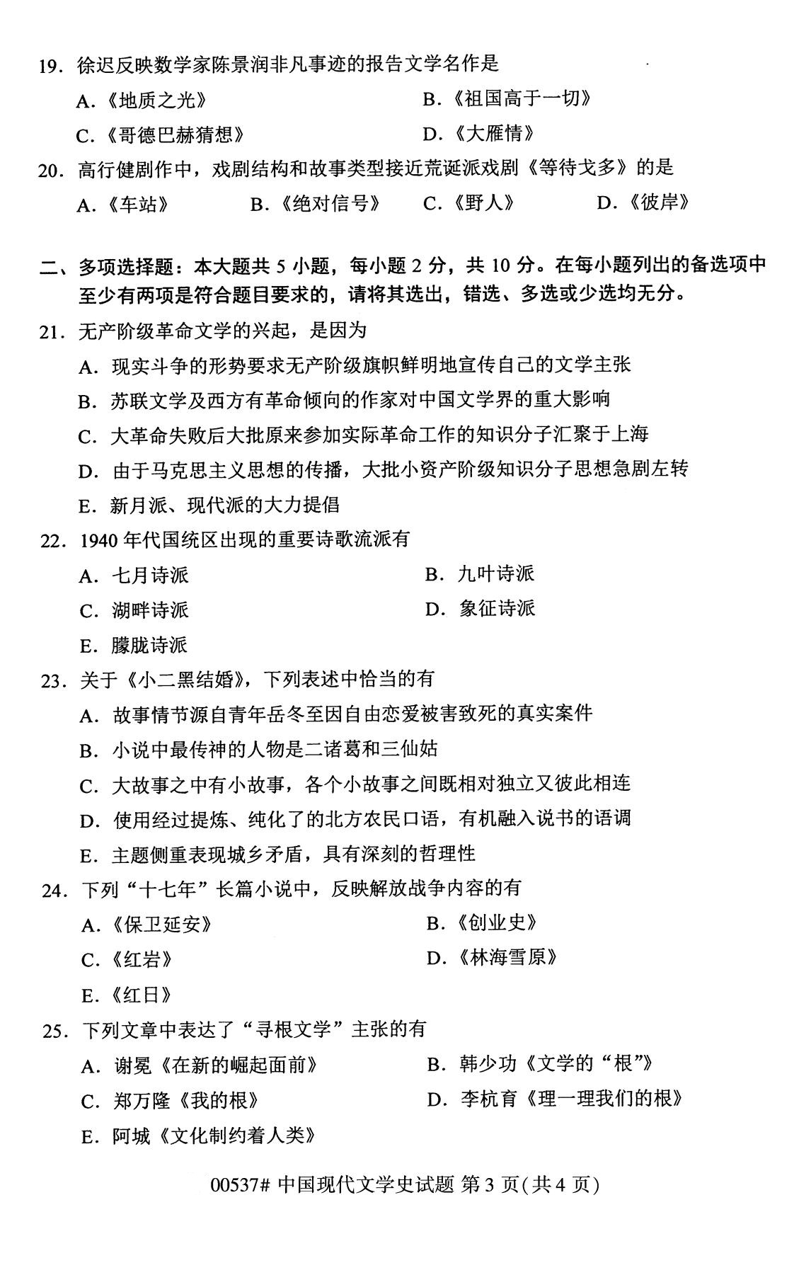 河南省2020年8月自学考试本科00537中国现代文学史真题